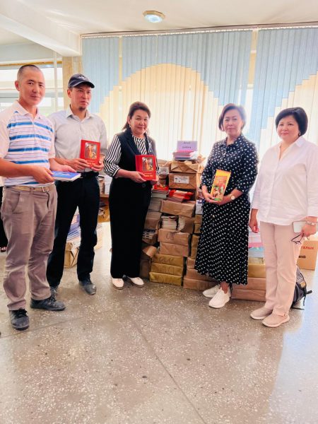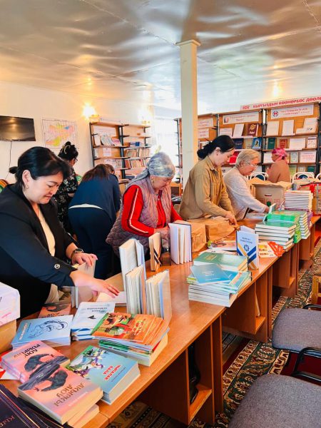 Китептерди жер-жерлердеги китепканаларга жеткирип, таркатуу иши Алыкул Осмонов атындагы Улуттук китепканага жүктөлүп, китеп кербенин Улуттук китепкананын директору Айнура Аскарова өзү жетектеп, Чүй, ЫсыкКөл, Ош, Жалал-Абад, Нарын, Талас облустук китепканаларында болду.