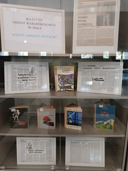 Кыргыз адабиятынын көрүнүктүү өкүлү, акын, драматург, жазуучусу, котормочу Ашым Жакыпбековдун чыгармачылыгына арналган кеңири форматтагы көргөзмө ачылды. Көргөзмөдө жазуучунун “Теңирим Манас”, “Катаал багыт”, “Биз атасыз өскөнбүз”, “Кыргыз жеринин жомоктору”, “Повестер жана аңгемелер” жыйнагы, “Шекерден Теңирге” китеби, балдарга арналган “Шаа Ата”, “Бала Манас” аттуу китептери жана басма сөз каражаттарына жарыяланган публицистикалык макалалары, изилдөөлөр, эскерүүлөр коюлду.